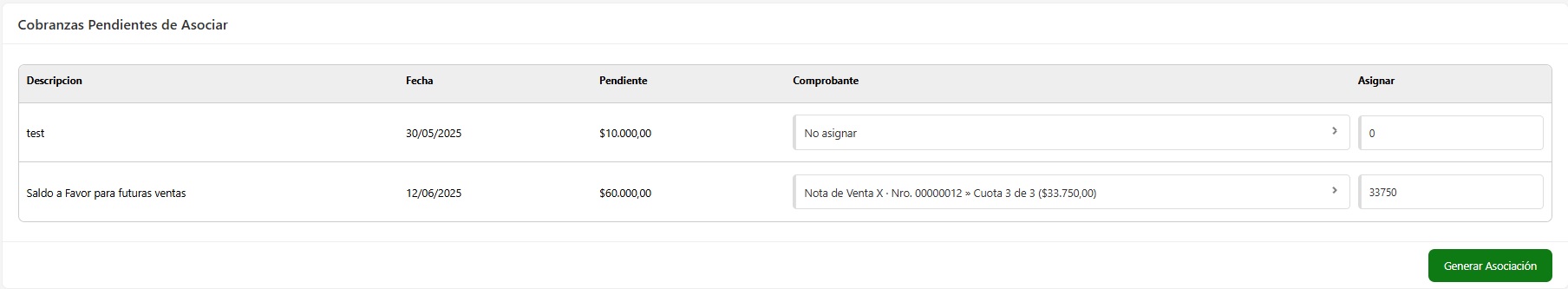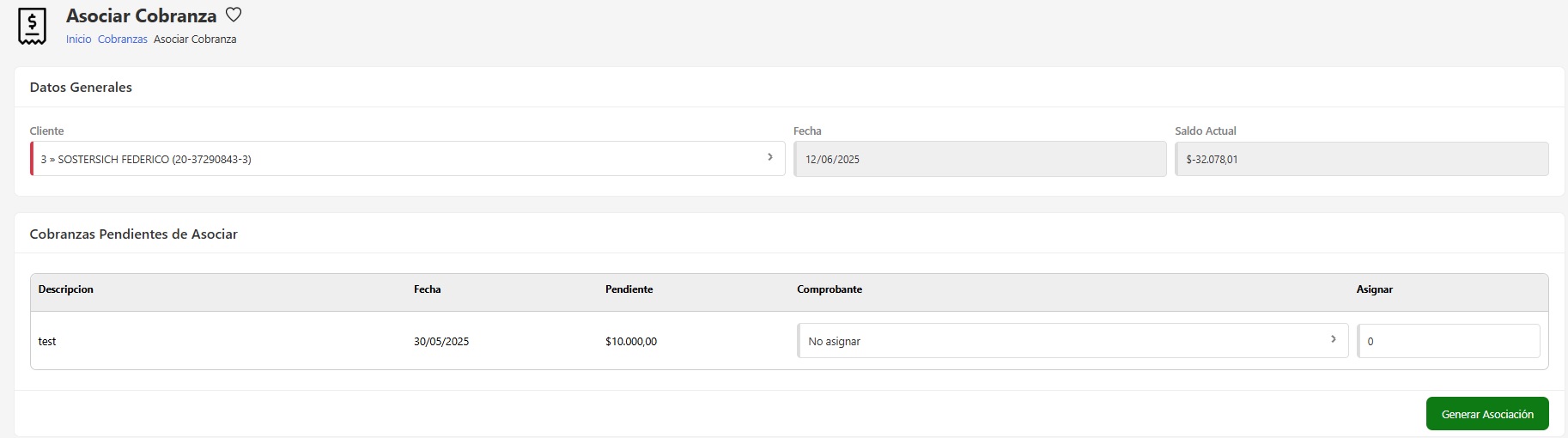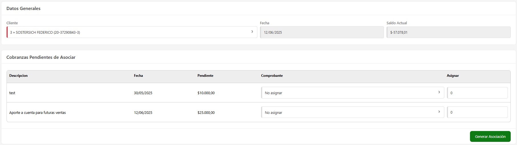 Una vez seleccionado el cliente vas a poder observar el saldo de la cuenta y debajo, listado las distintas cobranzas sin asociar.