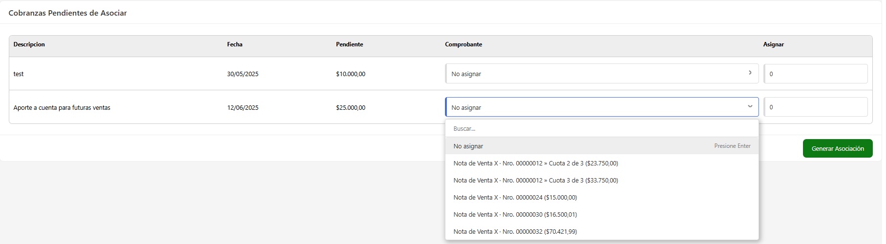 Esta función te permite asociar las cobranzas que hayas generado usando la opcion "En Cuenta Corriente" a un comprobante de venta emitido, en donde el dinero queda registrado como un saldo a favor en la cuenta corriente del cliente, y más adelante se puede usar para aplicar a futuras ventas o comprobantes.