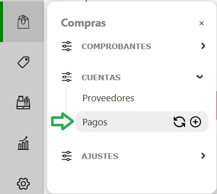 Para realizar la búsqueda de pagos cargados tenés que ingresar al módulo Compras que se encuentra en el panel principal izquierdo y luego en Cuentas y seleccionar Pagos.