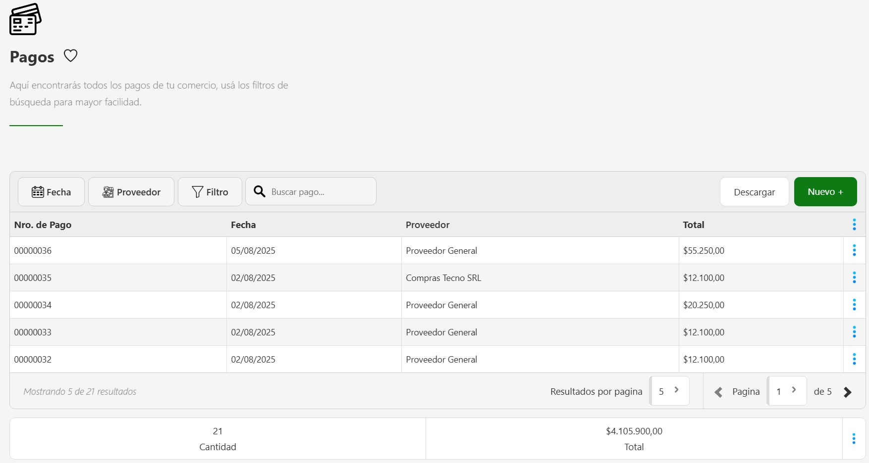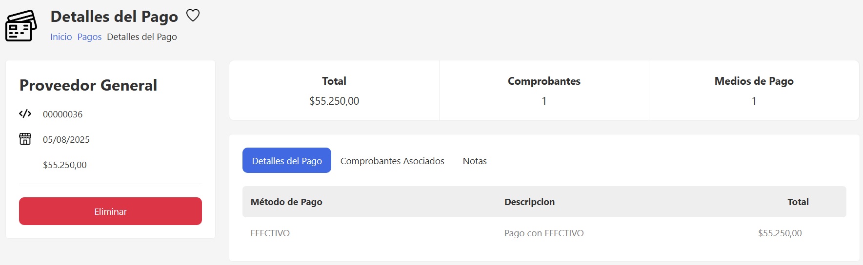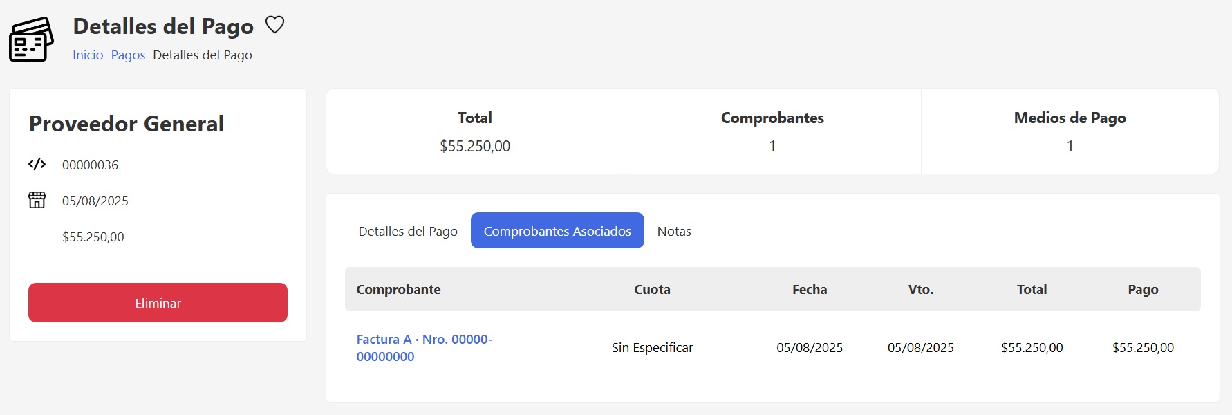 Desde esta pantalla podés consultar toda la información relacionada con un pago cargado: proveedor, importe, medio de pago, comprobantes asociados, formas de impresión y opciones de descarga.