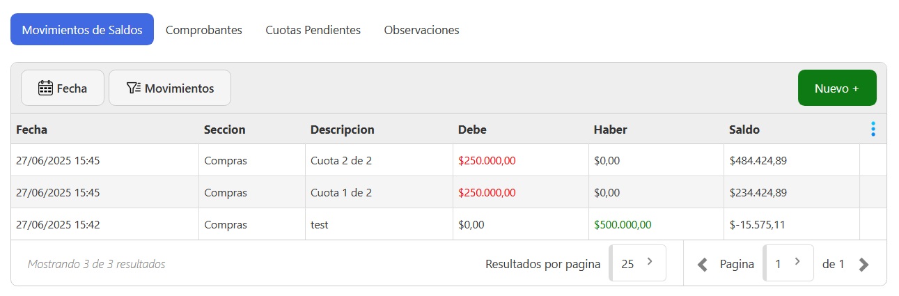- Movimientos de Saldo: Registra las operaciones realizadas, indicando fecha, sección, descripción, debe, haber y saldo resultante.