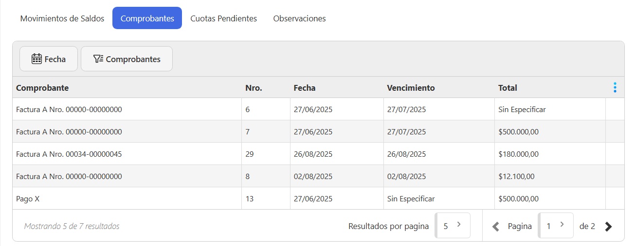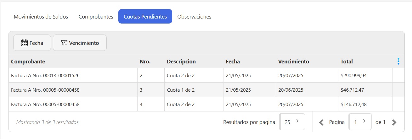- Cuotas Pendientes: Detalle de pagos pendientes organizados por vencimiento.