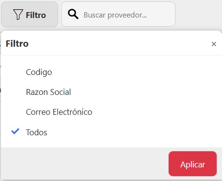 - Filtros: Código, Razón Social, Correo Electrónico, o Todos.