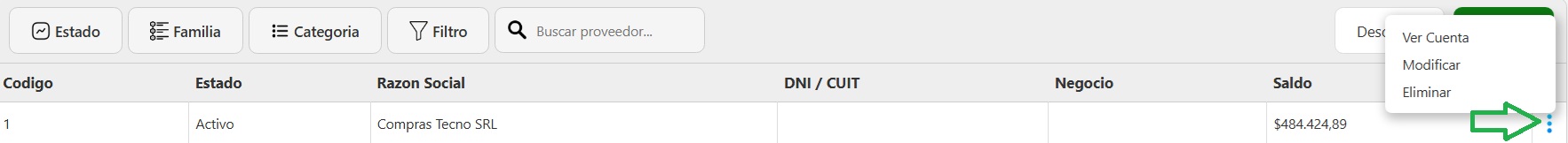 En el listado, cada proveedor tiene un menú de opciones (⋮) (tres puntos) a la derecha, desde donde podés: