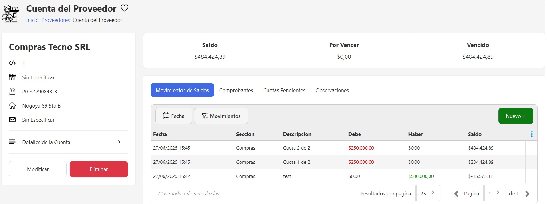 Esta pantalla te permite tener un control completo de la cuenta de tu proveedor, controla la mercadería, pagos y cuotas que debes.