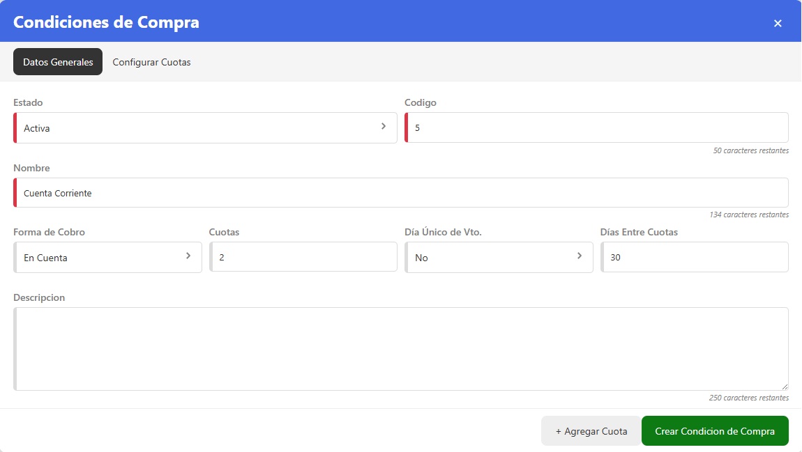 Descripción: Podes agregar una descripción interna a la condición de compra