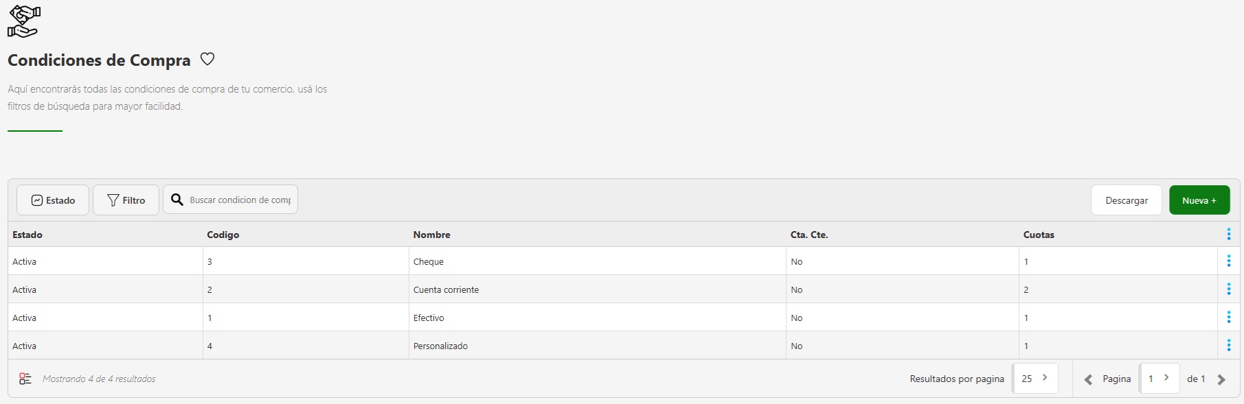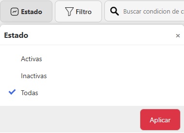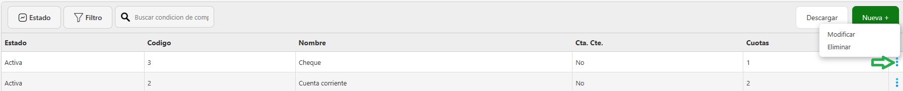 - Cada condicion de compra tiene un menú de opciones accesible desde los tres puntos verticales (⋮) que aparecen al final de su fila donde vas a encontrar las opciones de: