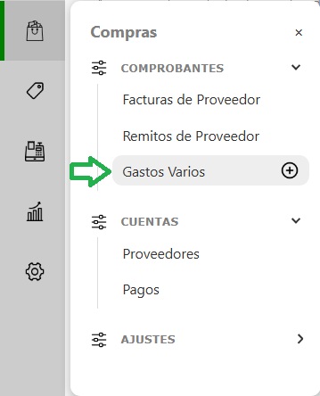 Para realizar la búsqueda de gastos cargados tenés que ingresar al módulo Compras que se encuentra en el panel principal izquierdo y luego en Cuentas y seleccionar Gastos Varios.