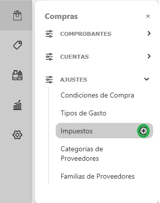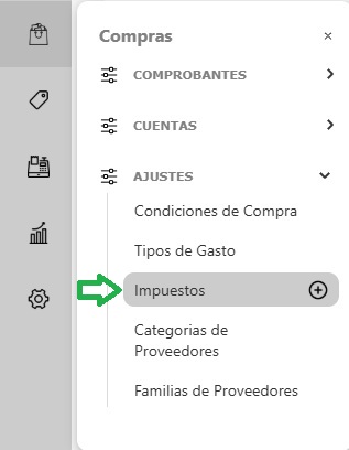 - En el panel izquierdo de funciones, ingresá a: Compras → Ajustes → Impuestos (por defecto el sistema te mostrará todos los que tengas cargados)
