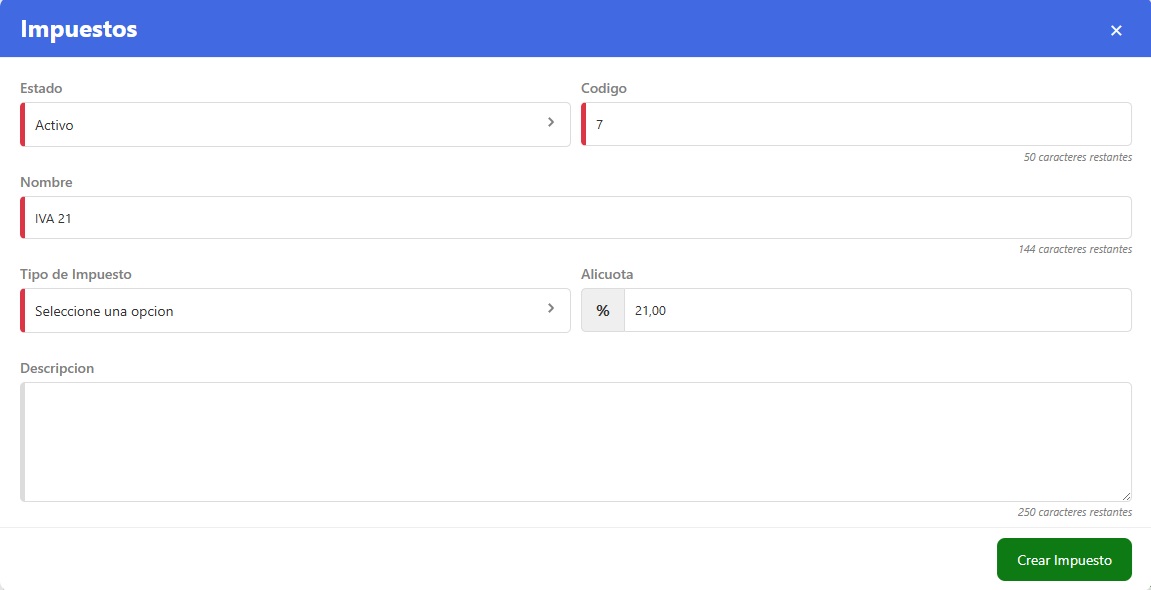 - Nombre (obligatorio): por ejemplo, IVA 21%, Percepción IIBB, Impuesto Interno, etc.