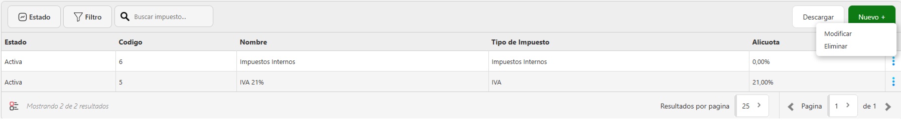 - Cada Impuesto tiene un menú de opciones accesible desde los tres puntos verticales (⋮) que aparecen al final de su fila donde vas a encontrar las opciones de: