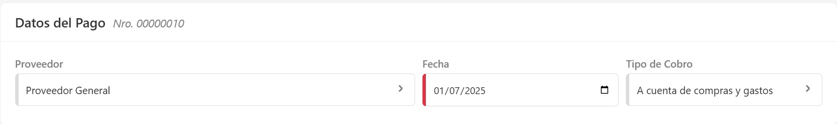 Este tipo de pago se utiliza cuando se cargó una Factura de Proveedor cuyo tipo de pago fue "En Cuenta", es decir, no se pagó en el momento, y ahora está abonando una o varias cuotas de esa compra.