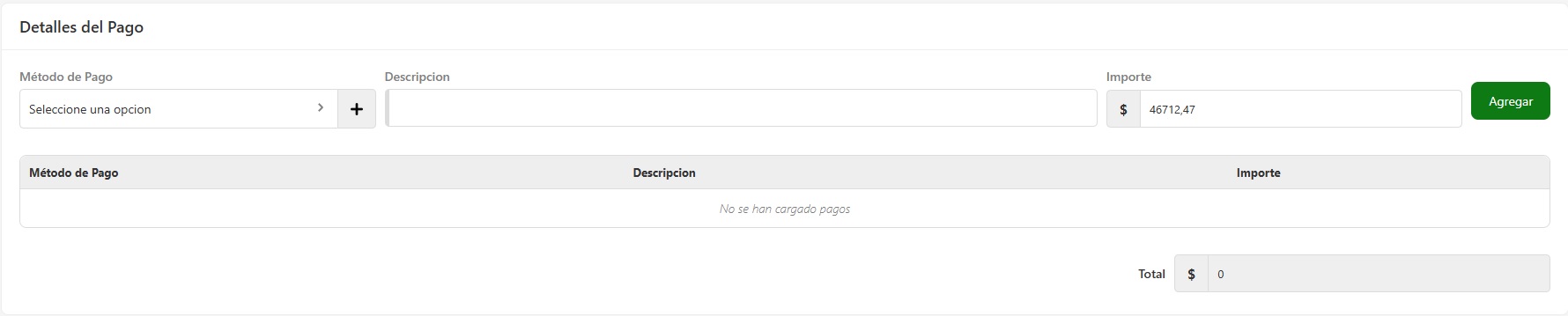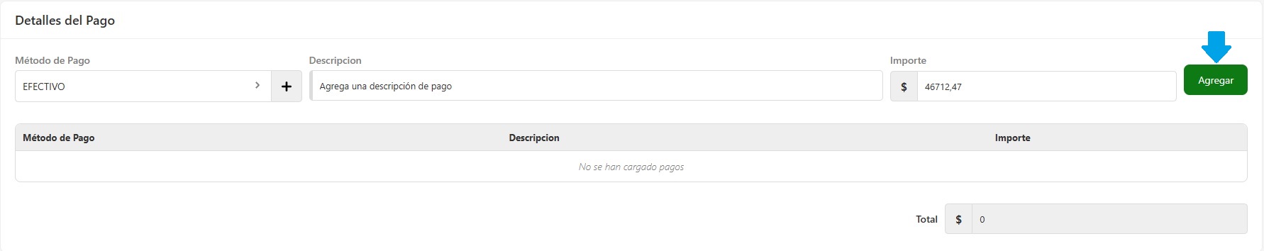 Una vez seleccionado el método de pago, agregá una descripción (opcional), completá con el importe y dale al botón Agregar