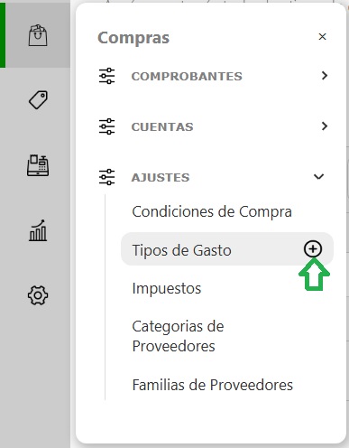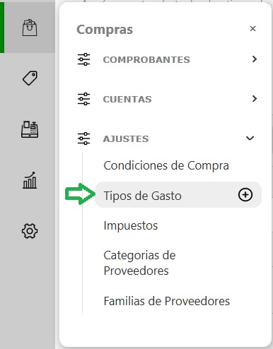 Para ver o modificar los tipos de gasto ingresa en el panel de la izquierda Compras → Ajustes → Tipos de Gasto