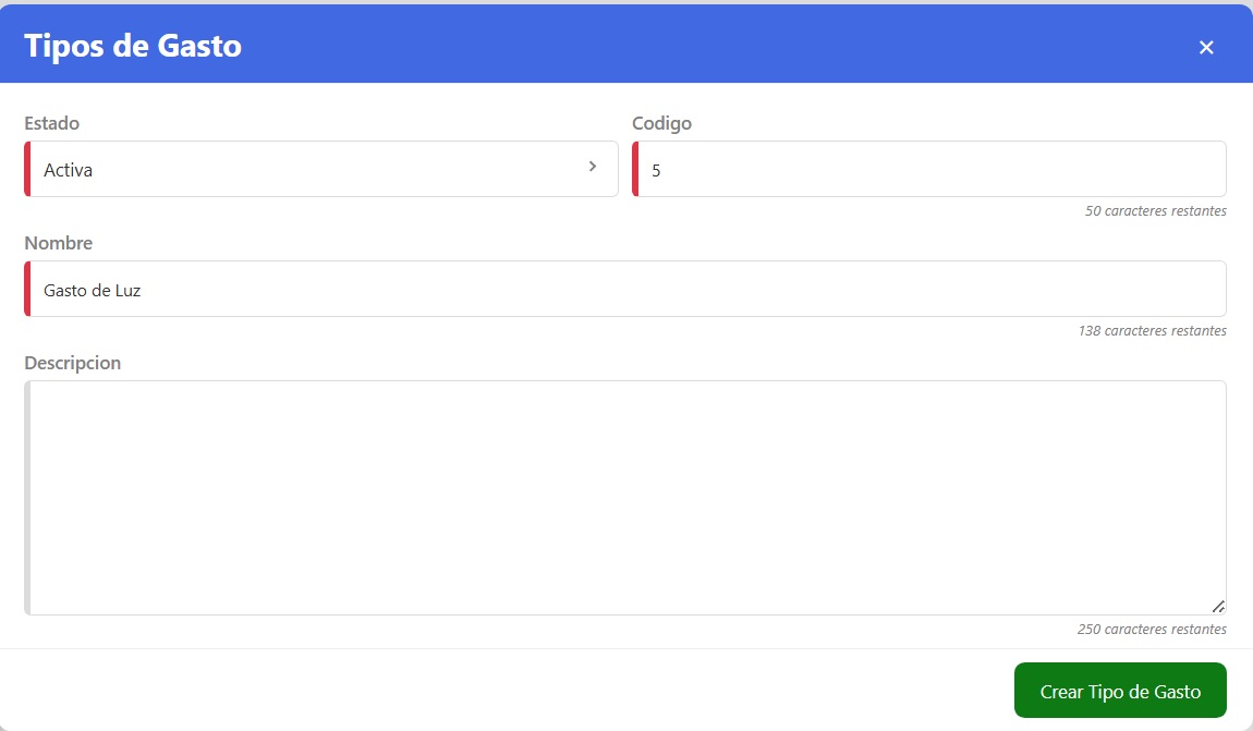 - Botón “Crear Tipo de Gasto”