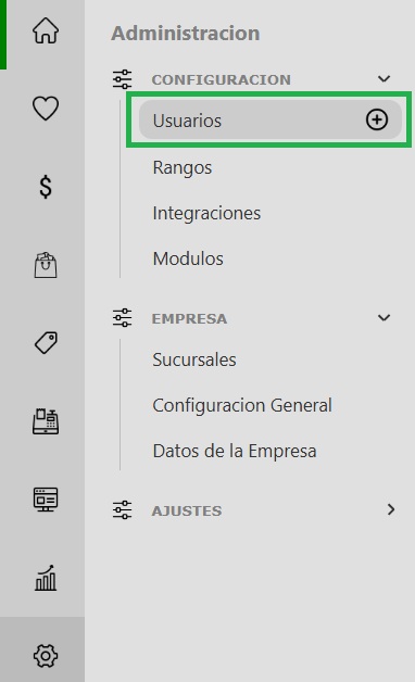 En el panel lateral izquierdo, dentro del módulo Administración, ingresá en Configuración y hace clic en + Rangos para crear uno nuevo, o si necesitas modificar uno existente hace clic directamente sobre la palabra Rangos