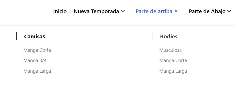 Ejemplo: “Parte de Arriba” sería el Menú → el mismo está compuesto por dos Sub-Menus que serían las Categorías de "Remeras" y "Bodies" → Cada categoría te lleva a su Sub-Categoría correspondiente como son "Manga Corta" "Manga 3/4" y "Manga Larga"