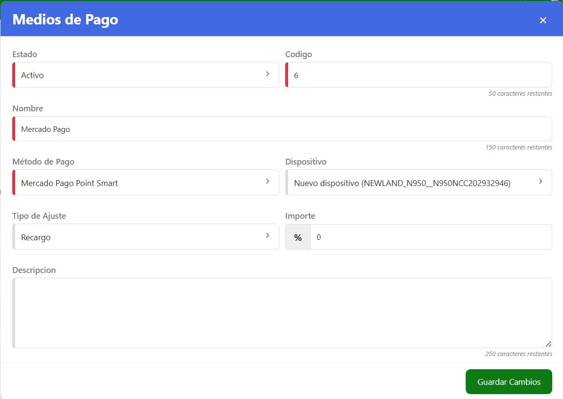 - Tipo de Ajuste: podes configurarle un descuento o recargo en este medio de pago.