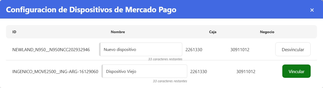 Luego de vincular tu cuenta de Mercado Pago será necesario vincular los dispositivos con los que vas a cobrar en el sistema.