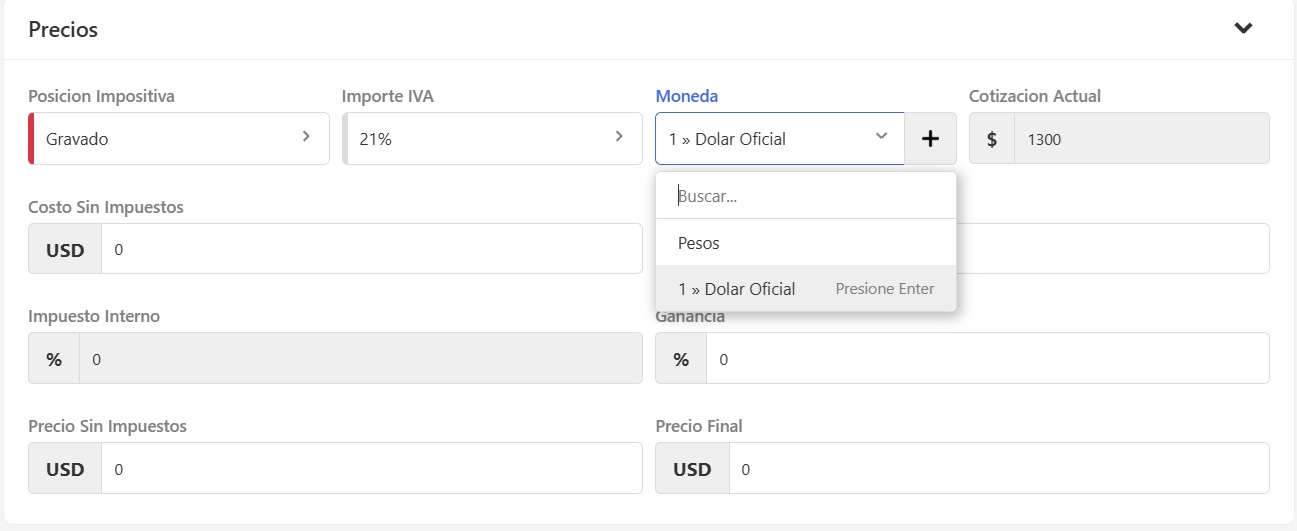 Por defecto está seleccionada la moneda Pesos argentinos, si tu producto varia su cotización en otra divisa podes cambiar la Moneda y seleccionar una que hayas creado previamente. Esto te va a permitir cargar los valores en la divisa correspondiente, actualizar los precios en esa moneda, o variar su precio según configures la cotización de la moneda. Al momento de venderlo el sistema hará el calculo automáticamente para pasarlo a Pesos argentinos.