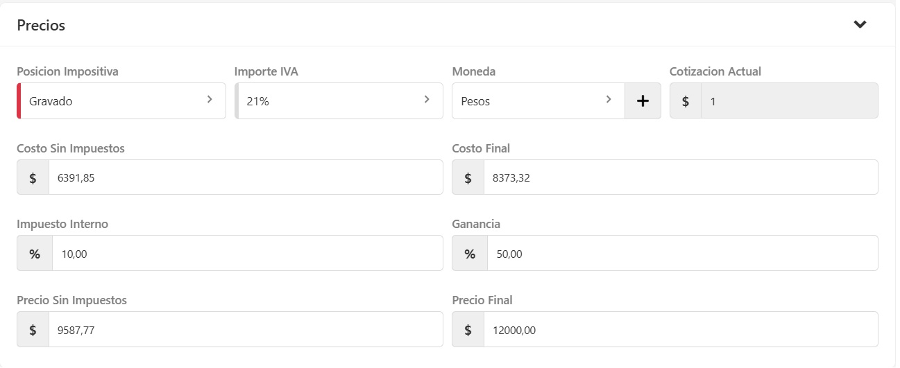 - Impuesto Interno: Colocá el valor del Impuesto interno en el caso de que el producto lo requiera (solo en Pesos se pueden aplicar Impuestos internos). Para conocer más del manejo de impuestos internos hace clic aquí.