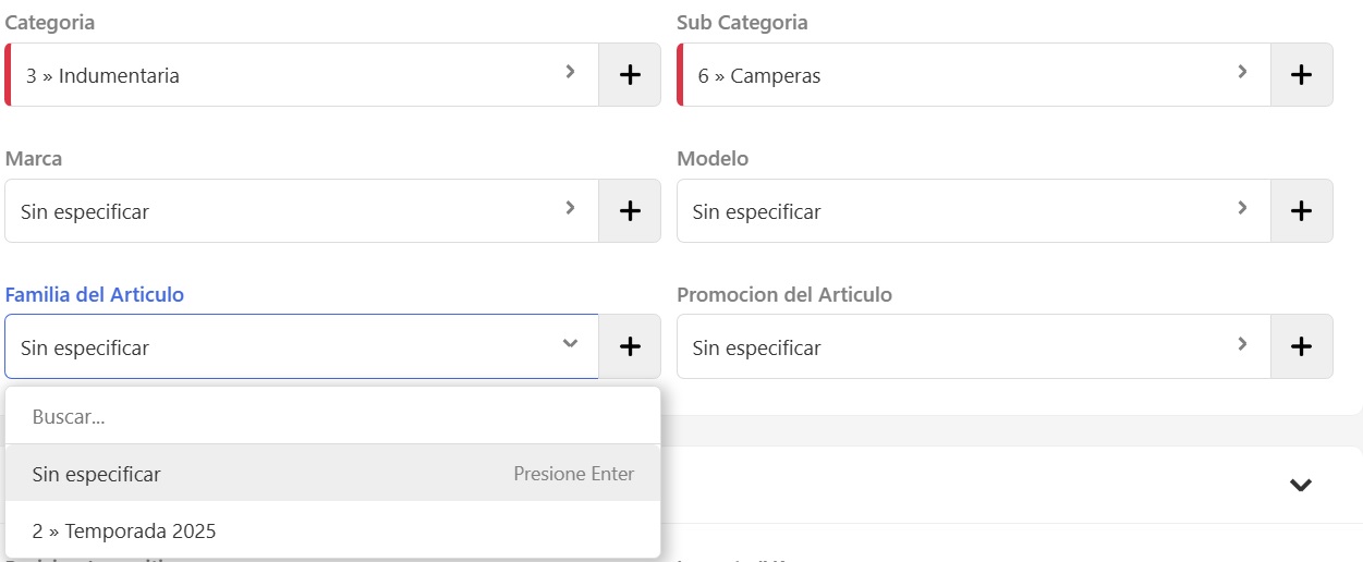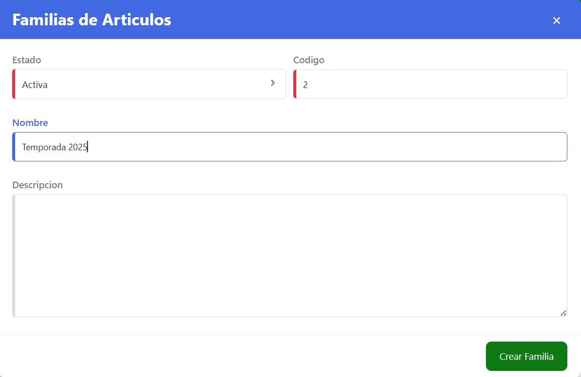 - Asignar artículos a una Familia: Al crear o editar un artículo, seleccioná una familia desde el campo correspondiente.