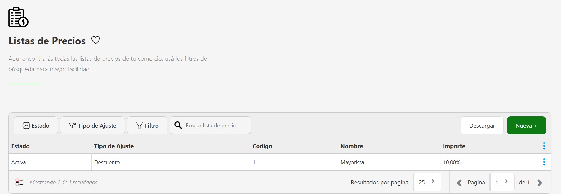 - Tipo de Ajuste: Seleccioná si la lista aplica un Descuento o un Recargo.