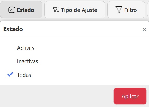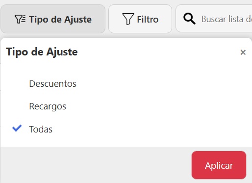 - Tipo de Ajuste: puede ser Descuento, Recargo o Todos (por defecto está seleccionado este último)