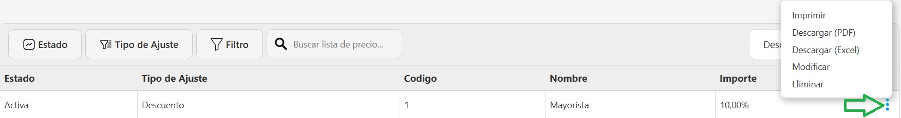 - Nombre: Identificador de la lista (por ejemplo: Mayorista, Liquidación).