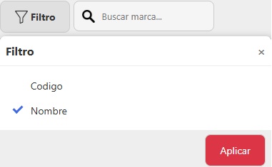 - Filtro: Puede ser Código o Nombre, una vez seleccionado uno en especifico completa el campo de búsqueda con la información correspondiente.