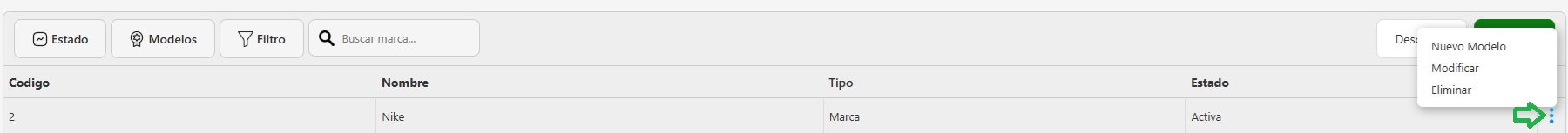 - Cada Marca tiene un menú de opciones accesible desde los tres puntos verticales (⋮) que aparecen al final de su fila donde vas a encontrar las opciones de: