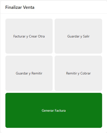 - Facturar: Genera una factura, lo cual cierra el proceso de venta.
