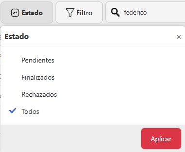 - Estado: Pendientes, Finalizados, Rechazados, o Todos.
