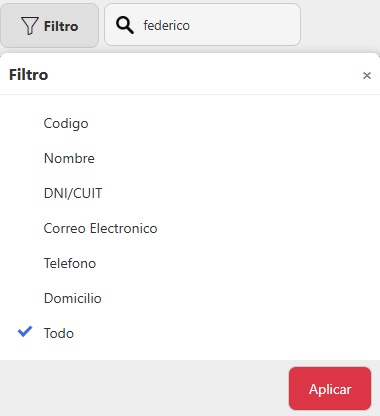 - Filtro: Puede ser Código o Nombre, una vez seleccionado uno en especifico completa el campo de búsqueda con la información correspondiente.