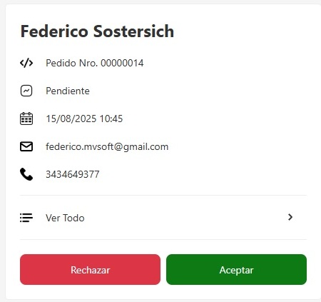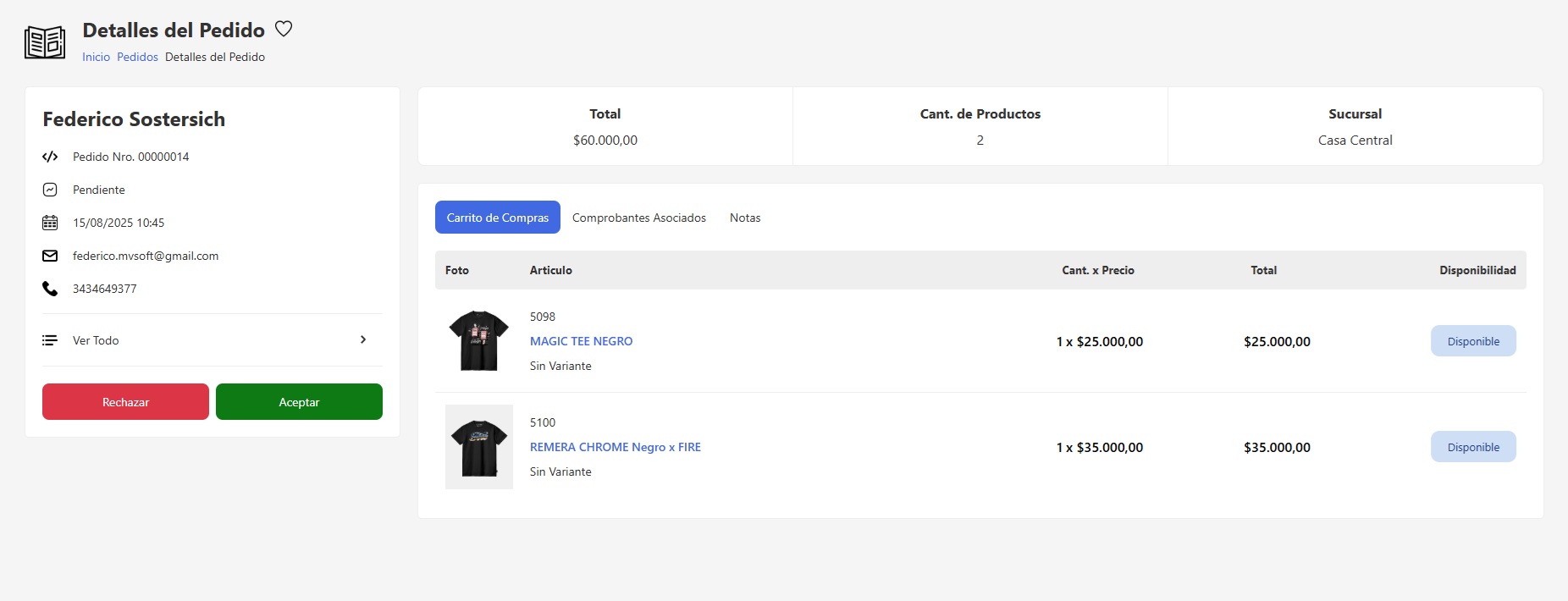 En esta misma sección vas a encontrar los botones para Aceptar o Rechazar el pedido. Una vez aceptado, el pedido será procesado y podrá ser utilizado como Comprobante a asociar en la sección Facturas.