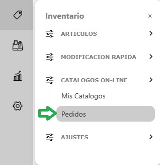 - En el panel izquierdo de funciones, ingresá a: Inventario → Mis catalogos → Pedidos (por defecto el sistema te mostrará todos los que tengas cargados)