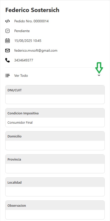 En la parte izquierda de la pantalla de detalles del pedido vas a encontrar los datos principales del pedido (nro de pedido, estado, fecha) y el cliente (nombre, contacto y más). También tendrás la opción "Más información" para ver datos adicionales como domicilio, localidad y otros.