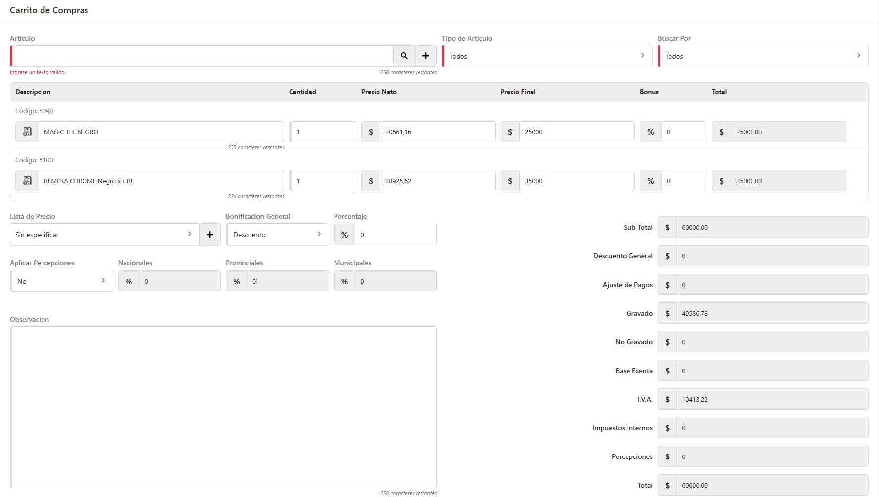 Una vez seleccionado el pedido el carrito de compras se completará con los artículos correspondientes.
