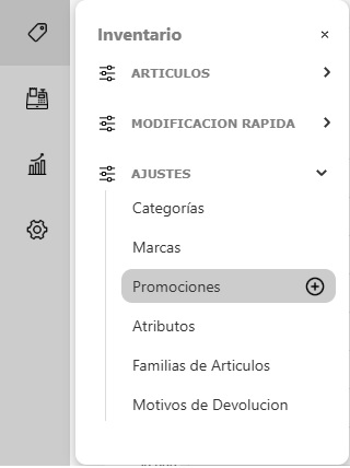 En el panel lateral izquierdo, dentro del módulo Inventario, dentro de la sección Ajustes hacé clic en el botón + Promociones