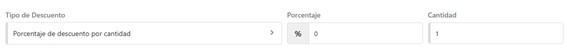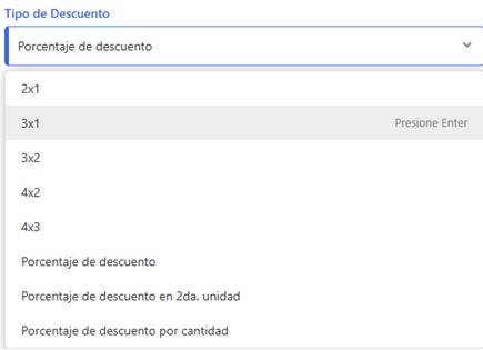 Tipo de Descuento: Selecciona el tipo de descuento, estos pueden ser por Cantidad o Porcentaje