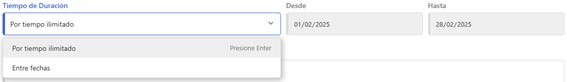 Tiempo de duración: Configurá el tiempo, estos pueden ser por Tiempo Ilimitado o Entre Fechas (en el caso de que selecciones Entre Fechas, selecciona las fechas Desde y Hasta)