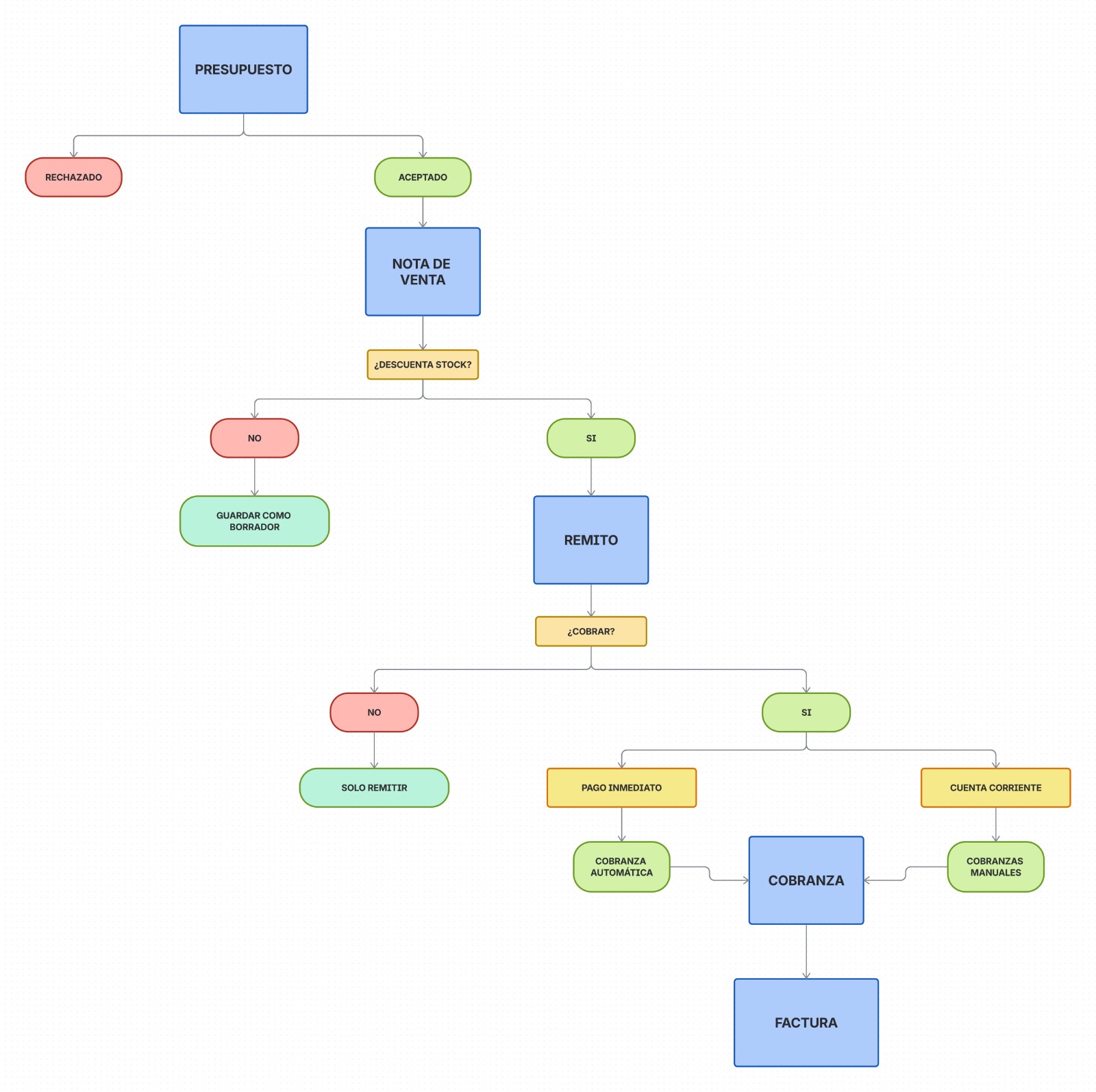 El siguiente diagrama muestra de forma resumida el circuito de ventas que podés aplicar en el sistema