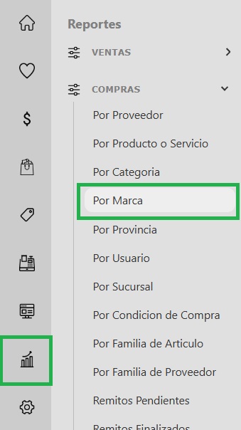 - Accedé al panel de gestión: Ingresá a tu sistema y, desde el menú lateral izquierdo, dirigite a la sección Reportes, seleccioná Compras -> Por marca.