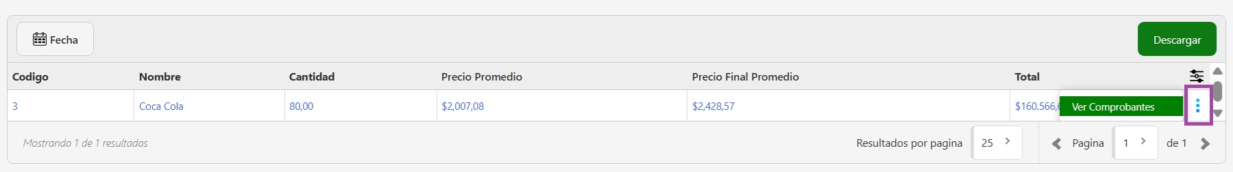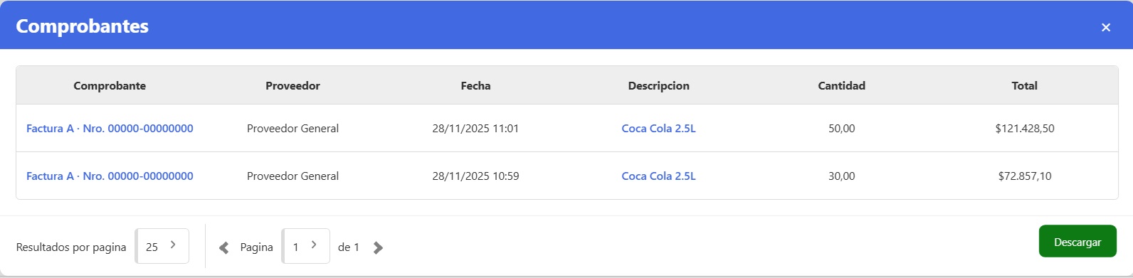 - Ver Comprobantes: aquí vas a ver todos los comprobantes de compra que contengan productos de esa marca y que componen al Total de ese período solicitado.