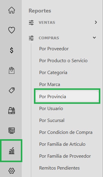 - Accedé al panel de gestión: Ingresá a tu sistema y, desde el menú lateral izquierdo, dirigite a la sección Reportes, seleccioná Compras -> Por provincia.