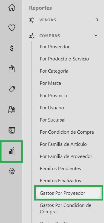 - Accedé al panel de gestión: Ingresá a tu sistema y, desde el menú lateral izquierdo, dirigite a la sección Reportes, seleccioná Compras -> Gastos por proveedor.