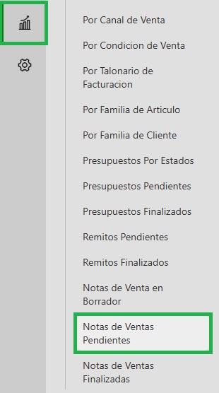 - Accedé al panel de gestión: Ingresá a tu sistema y, desde el menú lateral izquierdo, dirigite a la sección Reportes, seleccioná Ventas -> Notas de Venta pendientes.
