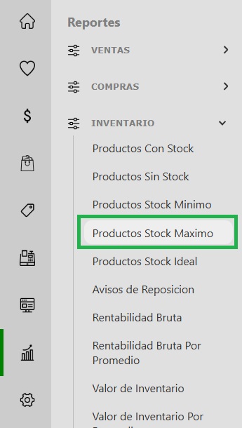 - Accedé al panel de gestión: Ingresá a tu sistema y, desde el menú lateral izquierdo, dirigite a la sección Reportes, seleccioná Inventario -> Productos con stock máximo.
