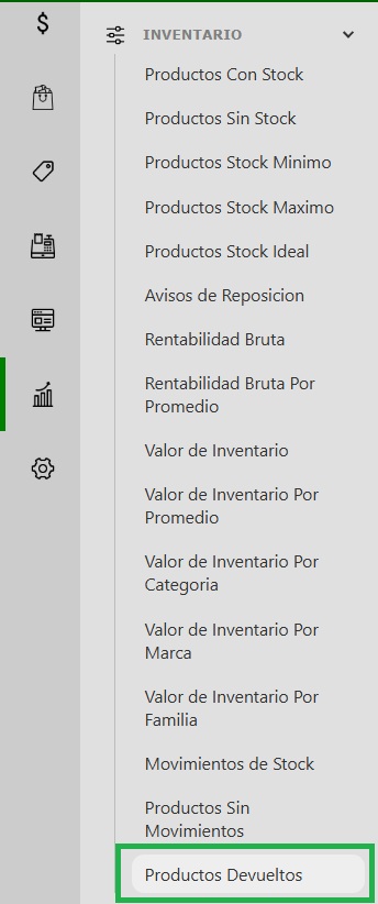 - Accedé al panel de gestión: Ingresá a tu sistema y, desde el menú lateral izquierdo, dirigite a la sección Reportes, seleccioná Inventario -> Productos Devueltos.