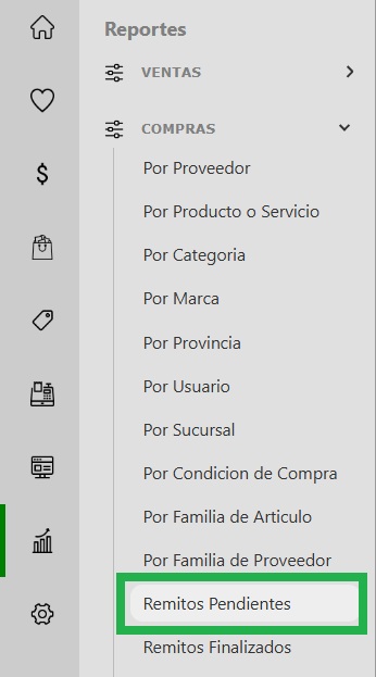 - Accedé al panel de gestión: Ingresá a tu sistema y, desde el menú lateral izquierdo, dirigite a la sección Reportes, seleccioná Compras -> Remitos de proveedor pendientes.